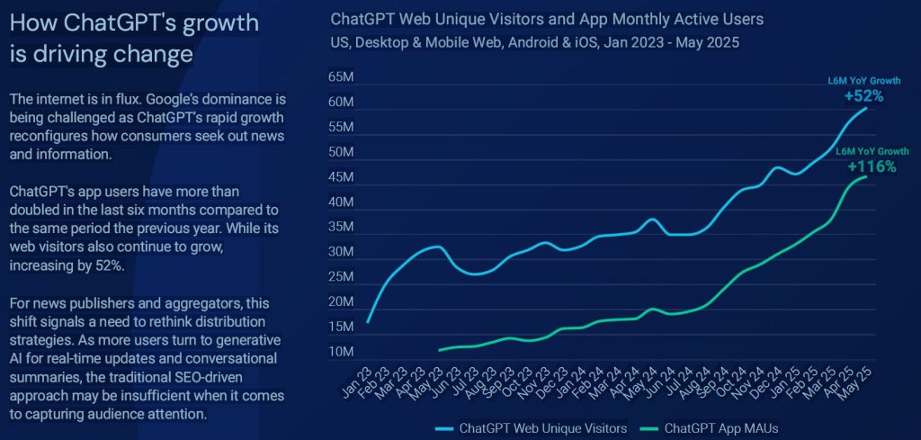At the same time, SimilarWeb also reports that news-related prompts in ChatGPT rose 212% between January 2024 and May 2025, while equivalent Google searches fell 5%. ChatGPT’s mobile app users have more than doubled year-on-year, and web visitors are up 52%, signalling a broader shift toward AI assistants for real-time news and analysis.