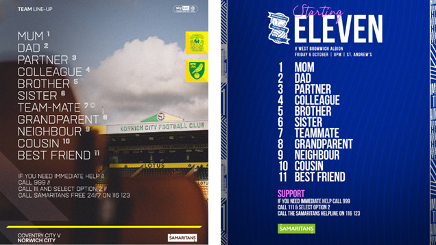 As the ad ends, after many games, the screen goes dark, and a message appears: “At times, it can be obvious when someone is struggling to cope, but sometimes the signs are harder to spot.” Then stalls reappear with the empty seats. The reserved man takes his seat, alone, and places a scarf where his friend should be. The implication is that his friend, despite his positivity, has committed suicide. His friend looks down the camera as the hashtag #YouAreNotAlone appears, followed by contact details for the Samaritans.